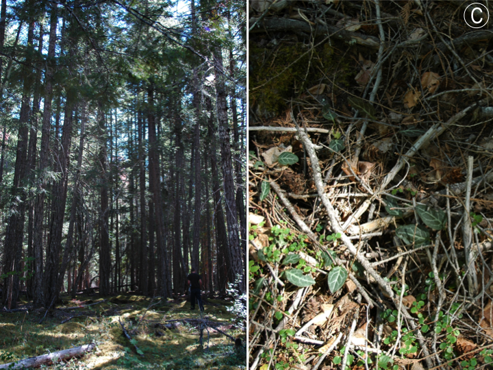 Common names for Pyrola picta Sm. include ‘white-veined wintergreeen’ and ‘picture-leaf wintergreen’, along with a few other variations on this theme. Photobleaching along the primary, secondary, and (to a lesser extent) tertiary veins in the leaf laminae can be quite striking against the ground, or appear camouflage in forests where light flecks created by the tree canopy move across the forest floor. Below are some examples of what I mean from forests in (A) Steamboat Springs,CO (B) Lassen County, CA, (C) southern British Columbia, CAN, (D) Burney Falls, CA, and (E) a spot near Burney Falls, CA. These light flecks can make it difficult to distinguish immediately between P. picta and some of its look-alikes….